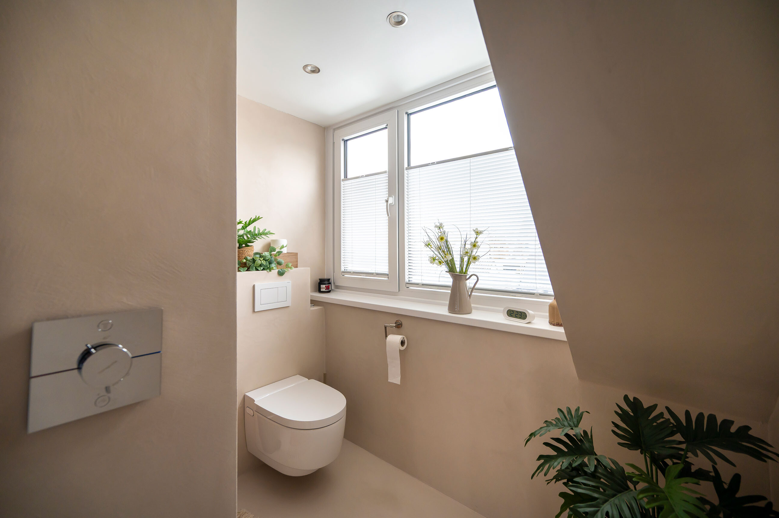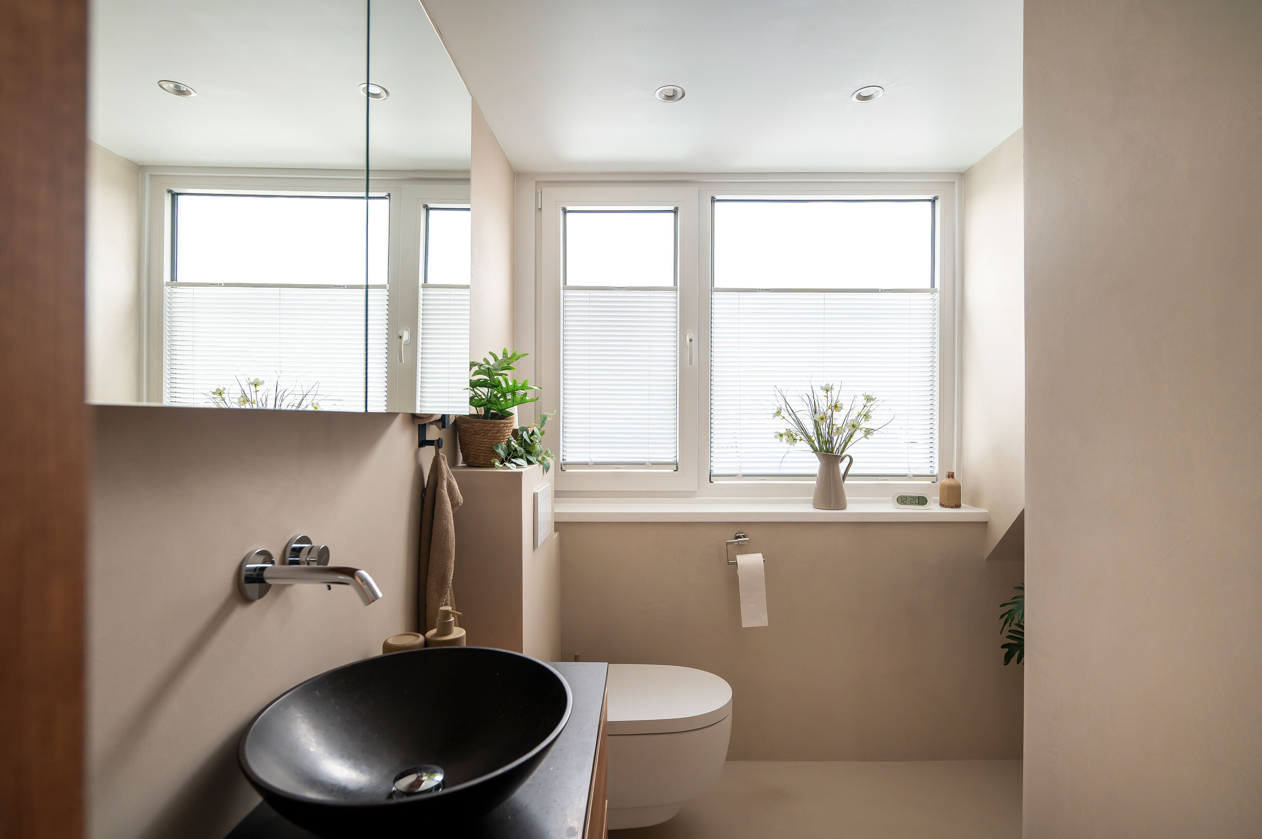 Er is gekozen voor een dakkapel van vier meter breed, die naadloos aansluit op de bestaande constructie. Het plafond loopt door tot in de nok, wat een uitzonderlijk ruimtelijk effect creëert. Deze ingreep maakte een compleet nieuwe indeling mogelijk, waarbij de badkamer optimaal kon worden ingericht met een inloopdouche en toilet.